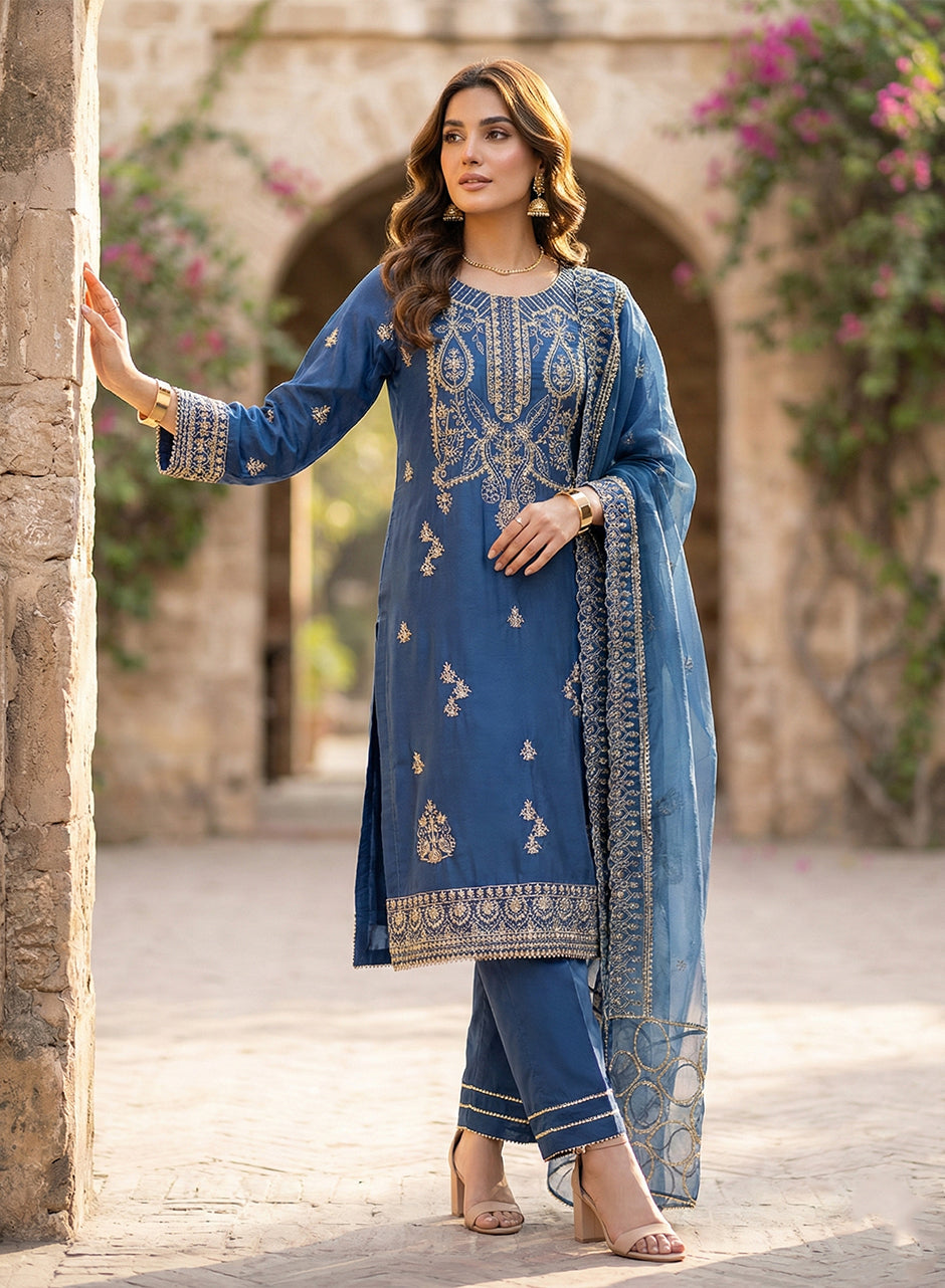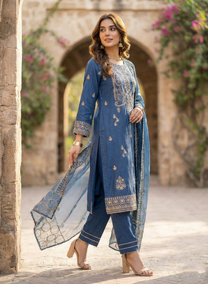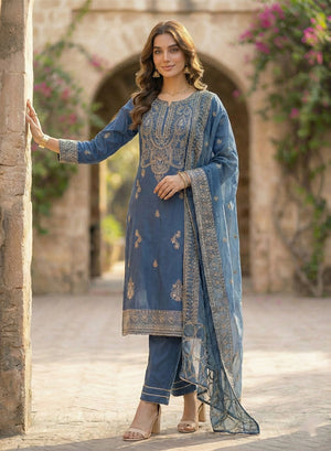 Style: Embroidered viscose shirt with viscose trouser and organza dupatta.