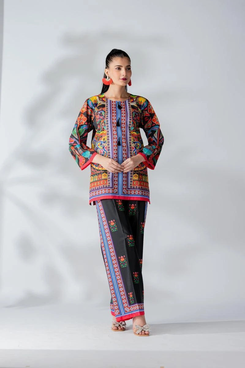 Straight printed shirt with plain black culottes. The bottom of culottes have printed fabric finishing near the opening.