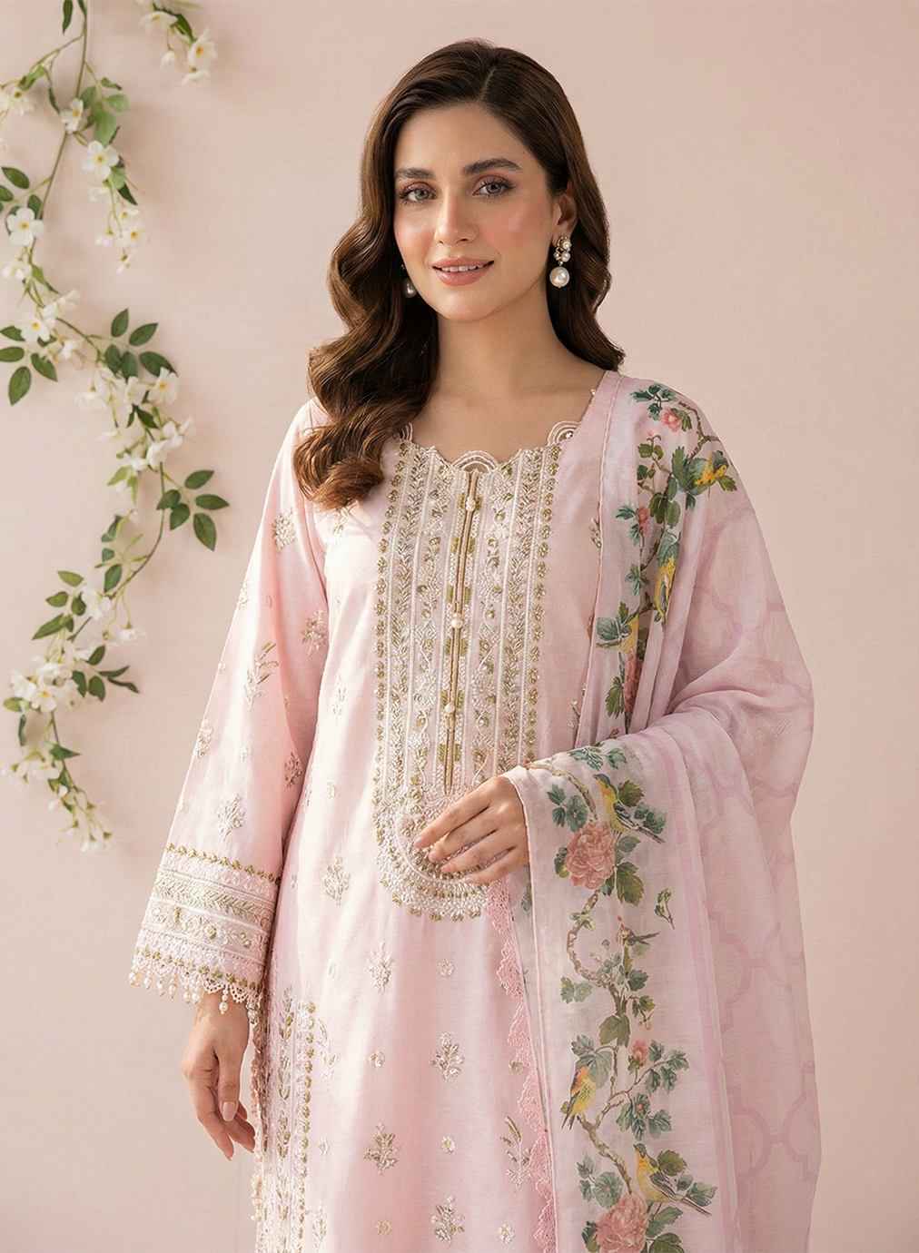 Style: Embroidered cambric shirt with flapper trouser and printed raw silk dupatta.