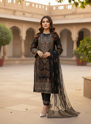 Style: Embroidered jacquard lawn shirt with lawn trouser and net dupatta.