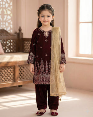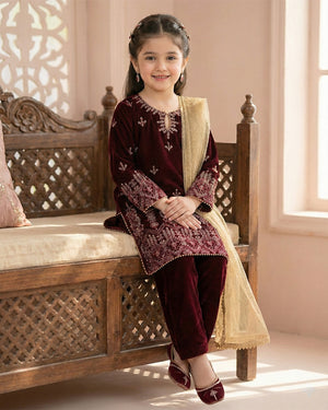 Style: Embroidered velvet shirt with velvet bottom and zari net dupatta.