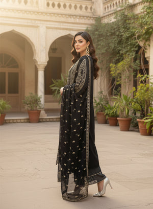 Style: Embroidered chiffon shirt with cotton silk trouser and embroidered chiffon dupatta.