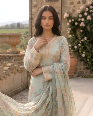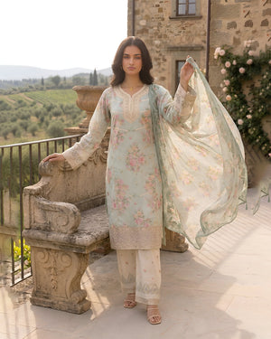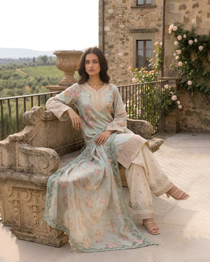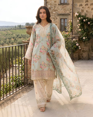 Style: Raw silk shirt with embroidered raw silk shalwar and printed munar dupatta.